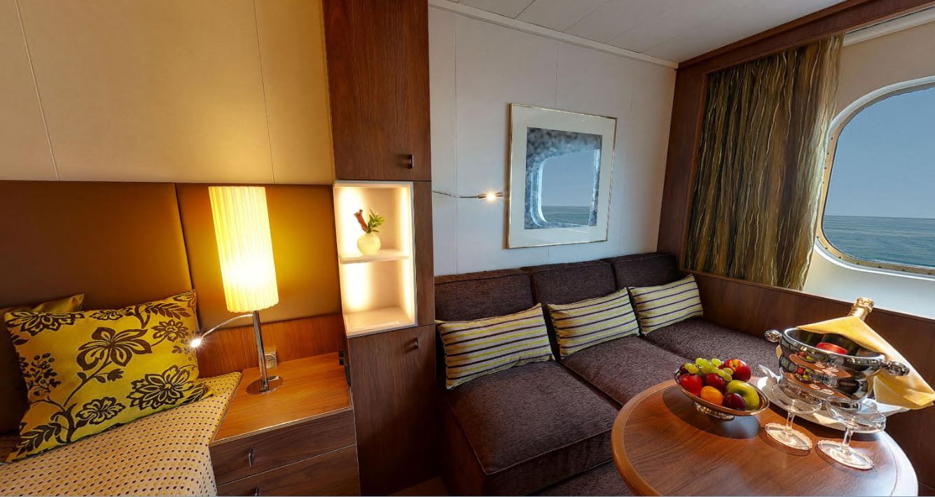 The Bar and Lounge – The social hub of Heritage Adventurer, the Bar and Lounge on Deck 5 features seating for all guests. Enjoy a beverage at the bar, sink into an armchair, relax on one of the many spacious loungers and watch the world go by through the panoramic windows or make new friends at the communal seating. This multi-tasking space also doubles as the location of daily briefings and evening recaps with the expedition team.