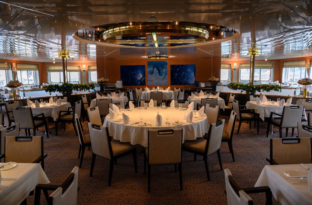 Dining Room – Indulge in fine international cuisine from our talented chefs in the lavish surrounds of our Dining Room on Deck 4. Sensational 270-degree views provide a stunning backdrop to meals here along with an international wine list featuring many outstanding regional wines. With relaxed seating arrangements, all guests can enjoy dining in a single sitting from hearty breakfasts setting you up for the day’s adventure to sumptuous lunches and multi-course evening dining.